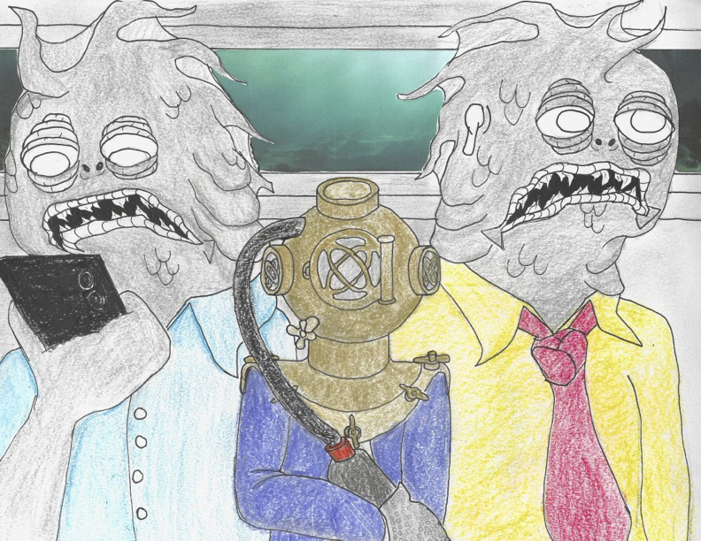 Then, behind ERIK’s back, FISH MAN 1 flips him the bird, throws the wet floor sign into the audience, and wheels the trolley away—exiting stage right.